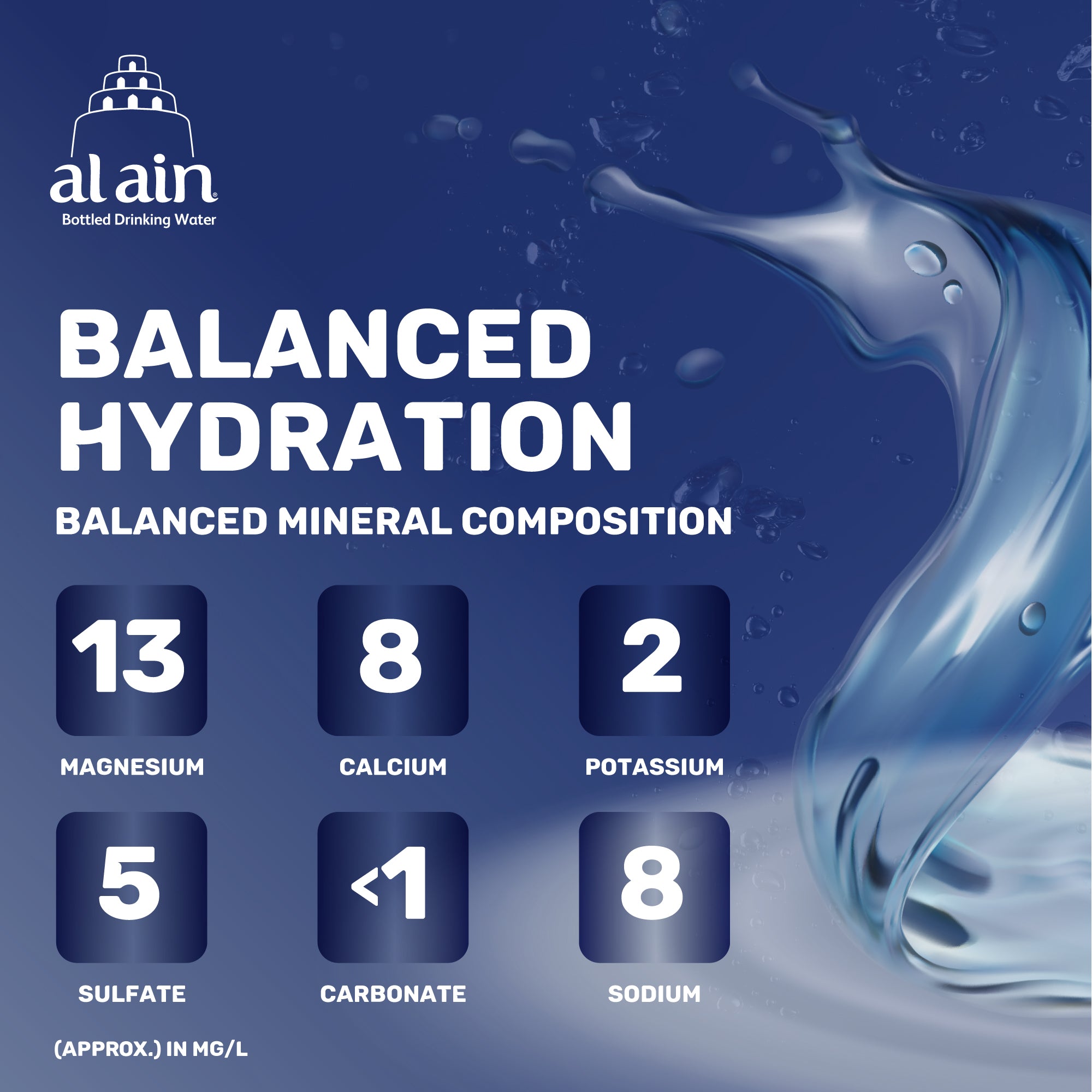 اختر الجودة، اختر العين: تركيبة معدنية متوازنة لتجديد ونضارة جسمك. تحتوي مياه العين على التوازن المثالي من المعادن الأساسية، مما يوفر طعماً ناعماً وسلساً بشكل فريد.