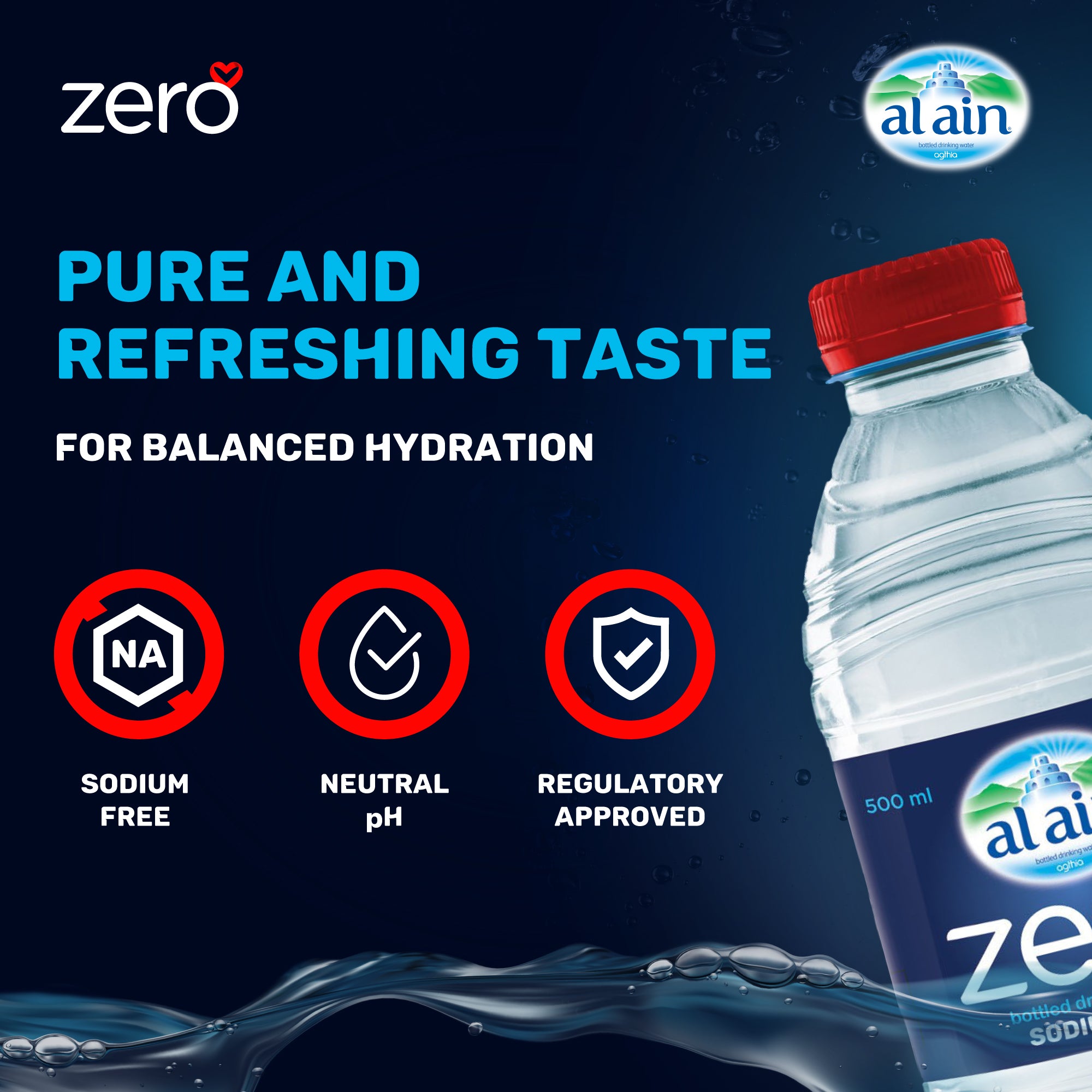 CHOOSE QUALITY, CHOOSE AL AIN: Al Ain Zero bottled water is a pH-neutral, sodium-free, and regulatory-approved water, specifically developed to meet your healthy hydration requirements.